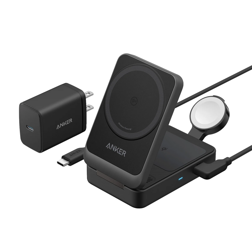 The Anker MagGo Wireless Charging Station (Foldable 3-in-1) delivers ultra-fast 15 W Qi2-certified charging for iPhone, AirPods, and Apple Watch simultaneously. Its compact, foldable design weighs just 6.9 oz, making it highly portable, while MFW certification powers an Apple Watch Series 9 to 47% in just 30 minutes. The built-in adjustable phone stand adds versatility, and the package includes a 40 W USB-C charger, 5 ft USB-C cable, welcome guide