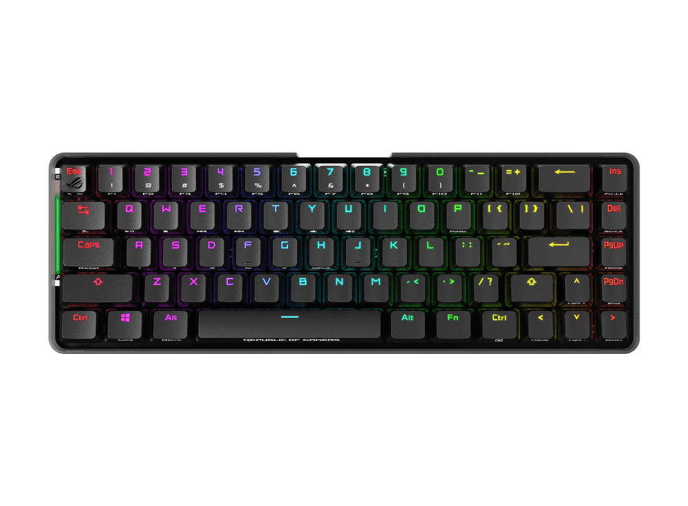 - ROG NX mechanical switches - Interactive touch panel for settings - PBT double-shot keycaps A compact wireless powerhouse with an impressive 450-hour battery life. It comes with a keyboard cover case for protection when you take your setup on the go. - Layout: 65% - Connection: 2.4GHz / Wired - Switches: NX Red
